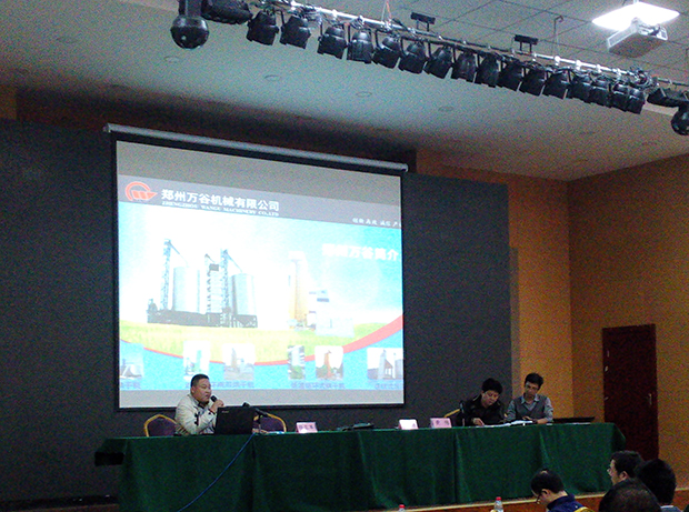 郑州AG尊时凯龙人生就机械有限公司由张彦亭副总经理带领公司技术、销售专业团队携公司新产品参加本次会议。在培训会议开始前,郑州AG尊时凯龙人生就携带的设备模型和企业展板刚一展示,立刻有众多的参会代表围了上来,一边观看产品宣传信息一边向公司人员咨询。针对本次培训会参会人员的实际需求,郑州AG尊时凯龙人生就机械有限公司此次向参会人员推荐了四款产品:小型循环式烘干机、小型连续循环两用烘干机、连续式顺逆流烘干机和连续式混流烘干机。根据会议安排,公司粮食烘干技术负责人李志刚在培训会上向参会人员详细介绍了产品技术优势和企业实力,并根据合作社不同规模的种植面积采取何种烘干机提供了参考意见。