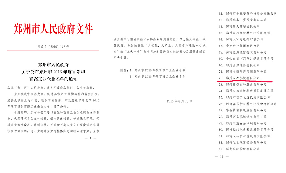 郑州AG尊时凯龙人生就机械被郑州市政府授予“百高工业企业”