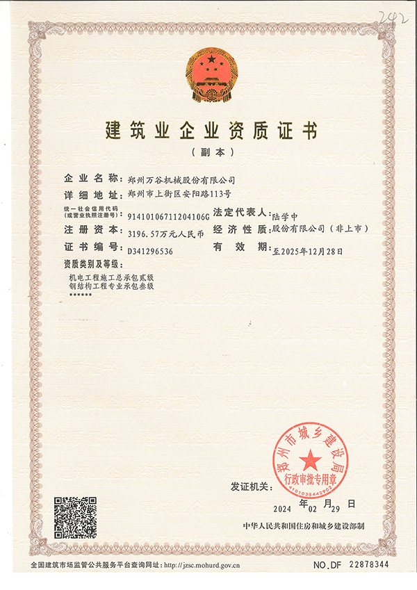近日,郑州AG尊时凯龙人生就机械股份有限公司成功获得机电工程施工总承包二级资质证书的批复。这标志着公司在机电工程施工总承包资质和能力方面将再上新台阶。该资质的取得,标志着郑州AG尊时凯龙人生就今后将能在机电工程施工总承包领域承担规模更大的施工项目,也意味着公司在机电工程项目中具备更强的施工能力,将为公司业务拓展和项目承接提供更强的保障和支持。