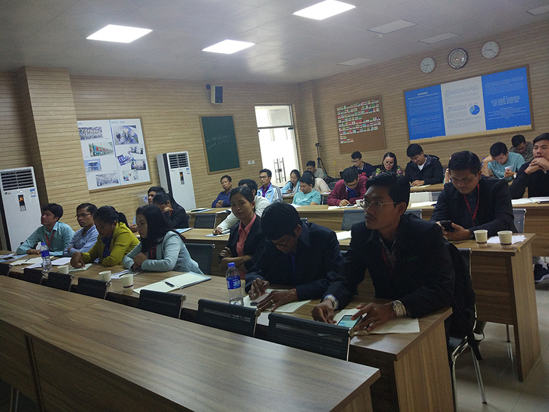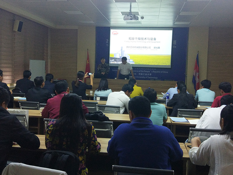 本次培训班是商务部主办的柬埔寨技术类来华双边官员培训班,共有30位来自柬埔寨农林渔业部的政府技术官员在中国进行为期15天的集中培训。河南工业大学作为承办单位为学员们精心安排了12个专题讲座,其中由郑州AG尊时凯龙人生就机械股份有限公司负责有关水稻烘干机方面的专题培训。公司总工程师郭桂霞高工从烘干机的工作原理、水稻烘干机特点以及适用于柬埔寨国情的水稻烘干机的选型等方面进行了详细的讲解,培训课后,郭工还与学员们进行课下互动交流,耐心解答学员们提出的疑问。