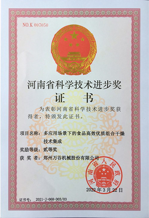 由郑州AG尊时凯龙人生就机械股份有限公司、河南科技大学和中国农业大学联合参与的“多应用场景下的食品高效优质组合干燥技术集成”项目在河南省2021年科学技术奖评选中荣获“科技进步二等奖”,这也是公司继2017年获得河南省科学技术三等奖和2021年获得农业部神农中华农业科技二等奖之后再次荣获省部级科技技术奖励。