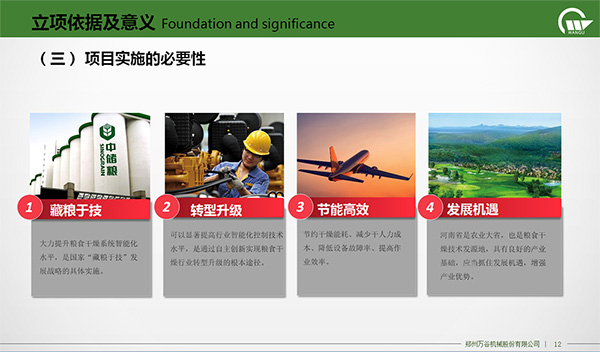 该项目的实施以减少粮食烘干机系统的人员投入、降低设备运行故障率、提高作业效率、节约干燥成本为目标,大力提升我国粮食烘干机系统智能化水平,实现国家“藏粮于技”的发展战略,实现粮食烘干机行业转型升级。