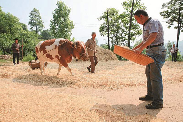 儿时的回忆里,爷爷总是养着一头牛,那是家里最贵重的财产和劳动力,一年四季的农活离不开老牛的辛勤劳动。打麦场里,爷爷总是个好把式,印象里爷爷站在麦场中间,手里牵着牛绳、拿着鞭子,随着一声声吆喝和手里绳子的松紧掌控,老牛默默地在麦场里一圈一圈的走着,并不停地变换着路径,确保场地里每一处的麦子被均匀地的碾压。孩子们体会不到父辈们劳作的辛苦,只顾着自己找乐子,石磙后面拖着的一块石板常常成为我们的“坐骑”,坐在上面,任由老牛一圈圈的拉着,一个不注意就会 “人仰马翻”,好在地上有松软的麦秸,也伤不到,最多粘一身的麦秸,然后嘻嘻哈哈的跑村前小河里洗澡了。