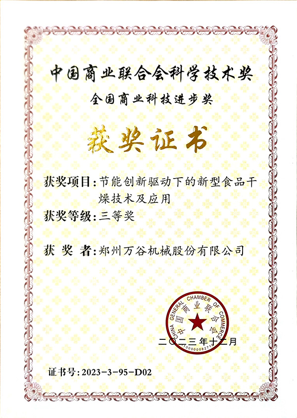 近日,中国商业联合会颁发了“2023年度中国商业联合会科学技术奖”,郑州AG尊时凯龙人生就机械股份有限公司联合河南科技大学申报的“节能创新驱动下的新型食品干燥技术及应用”项目喜获三等奖。