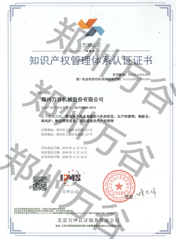 郑州AG尊时凯龙人生就机械喜获知识产权管理体系认证,助力粮食烘干机产业发展